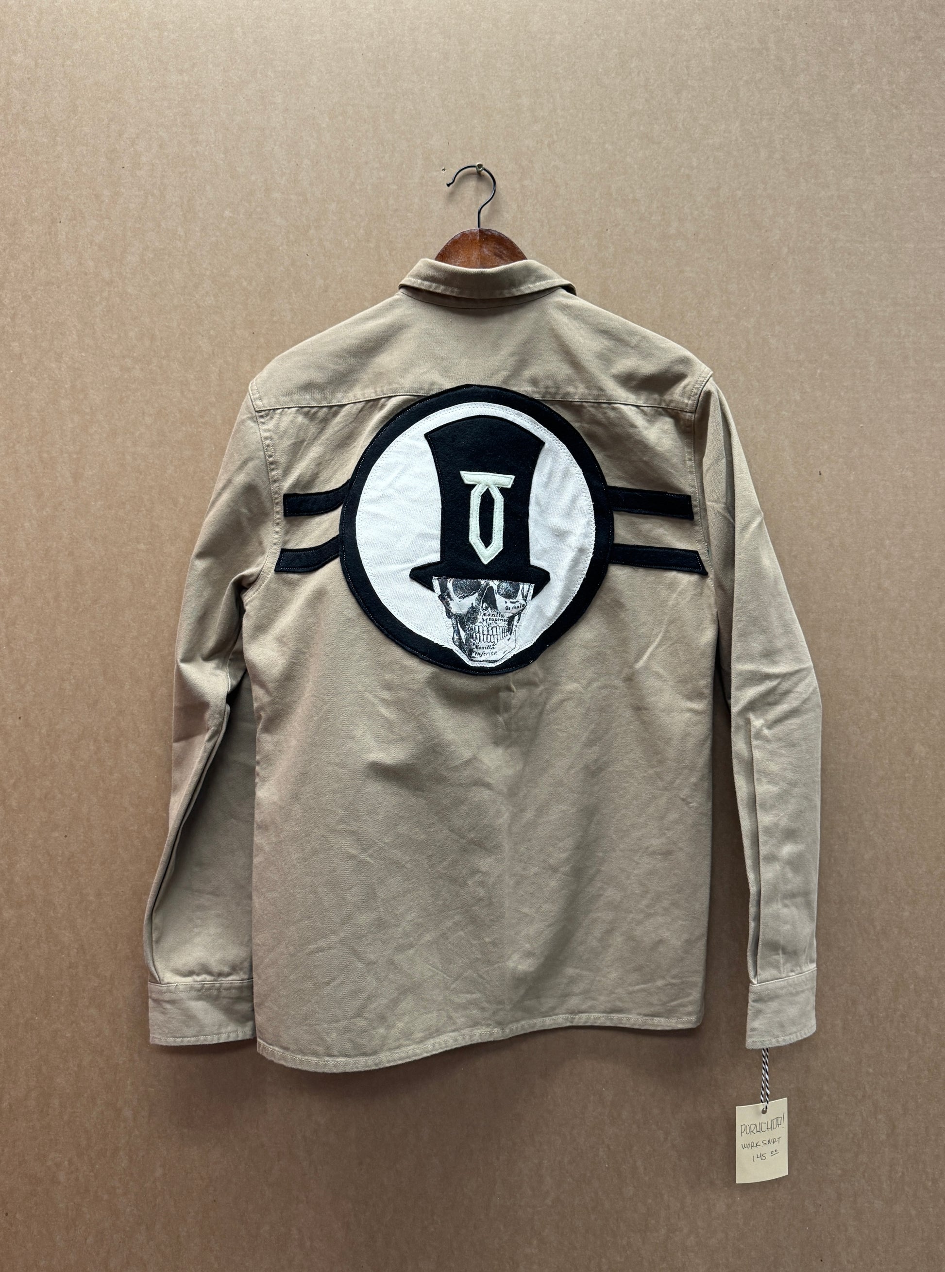 Upcylced tan Primark long sleeve work shirt with sewn patches on front chest, and sewn patches on the back in style of skull with top hat.